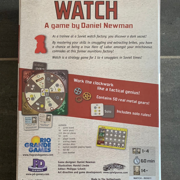 The artistically composed thematic Eurogame Watch blends theme into the game mechanisms masterfully: While playing, you can feel the clock ticking as you try to hide your mischievous actions from the other players. To succeed, you must ensure that the gears fall into their specific clockwork spot exactly when and where you need it!